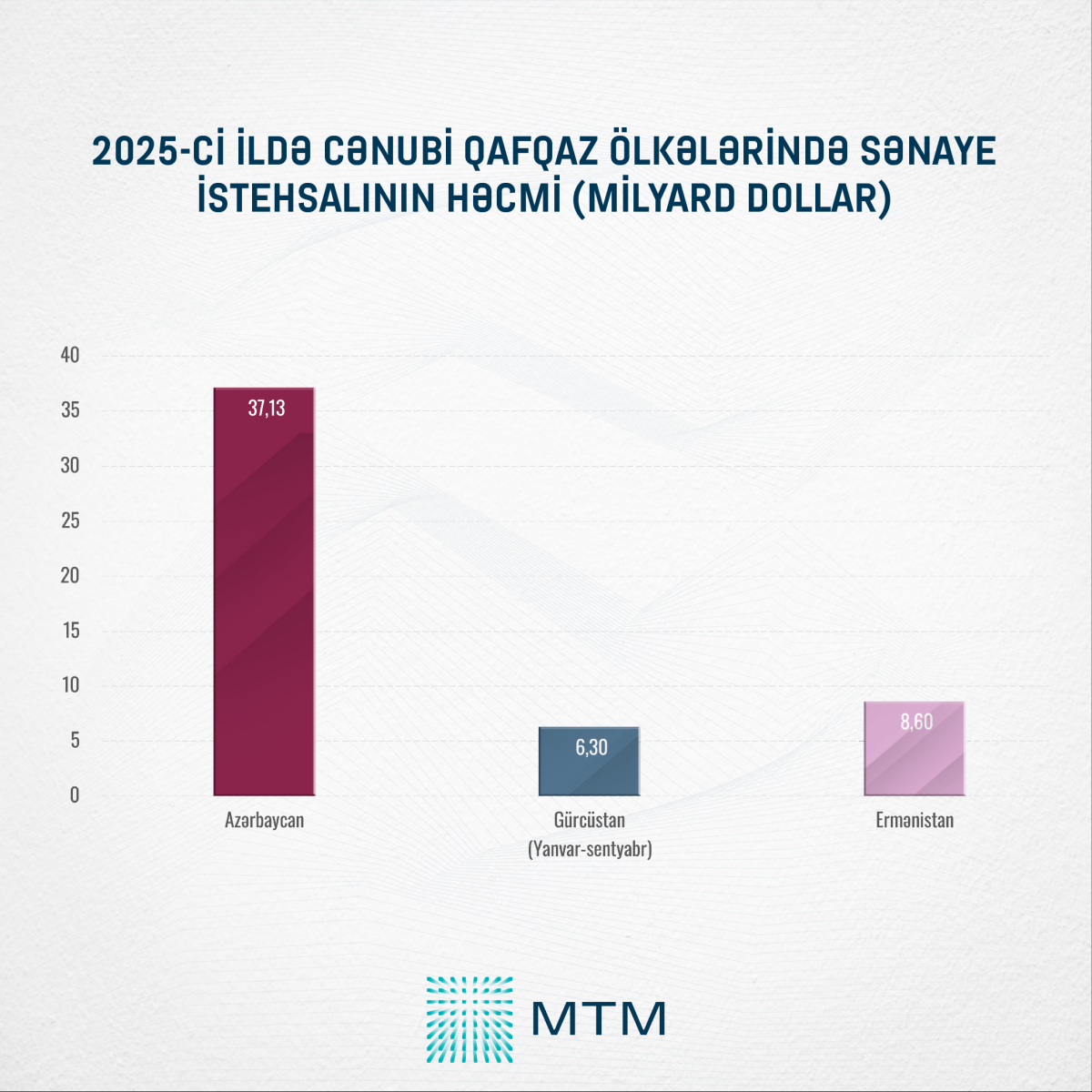 Cənubi Qafqaz ölkələrinin statistika qurumlarının açıqladığı rəsmi məlumatlara əsasən, 2025-ci ildə Azərbaycanda sənaye istehsalının həcmi 37,13 milyard dollar təşkil edib. Bu göstərici regionun digər ölkələri ilə müqayisədə əhəmiyyətli dərəcədə yüksəkdir.