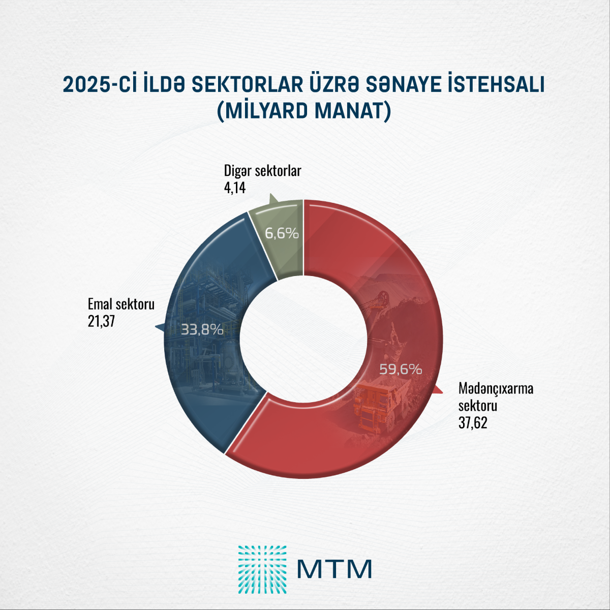 Emal sənayesi isə 2025-ci ildə ümumi istehsalın 33,8 faizini formalaşdırıb. İl ərzində bu sektor üzrə 21,37 milyard manatlıq məhsul istehsal edilib.