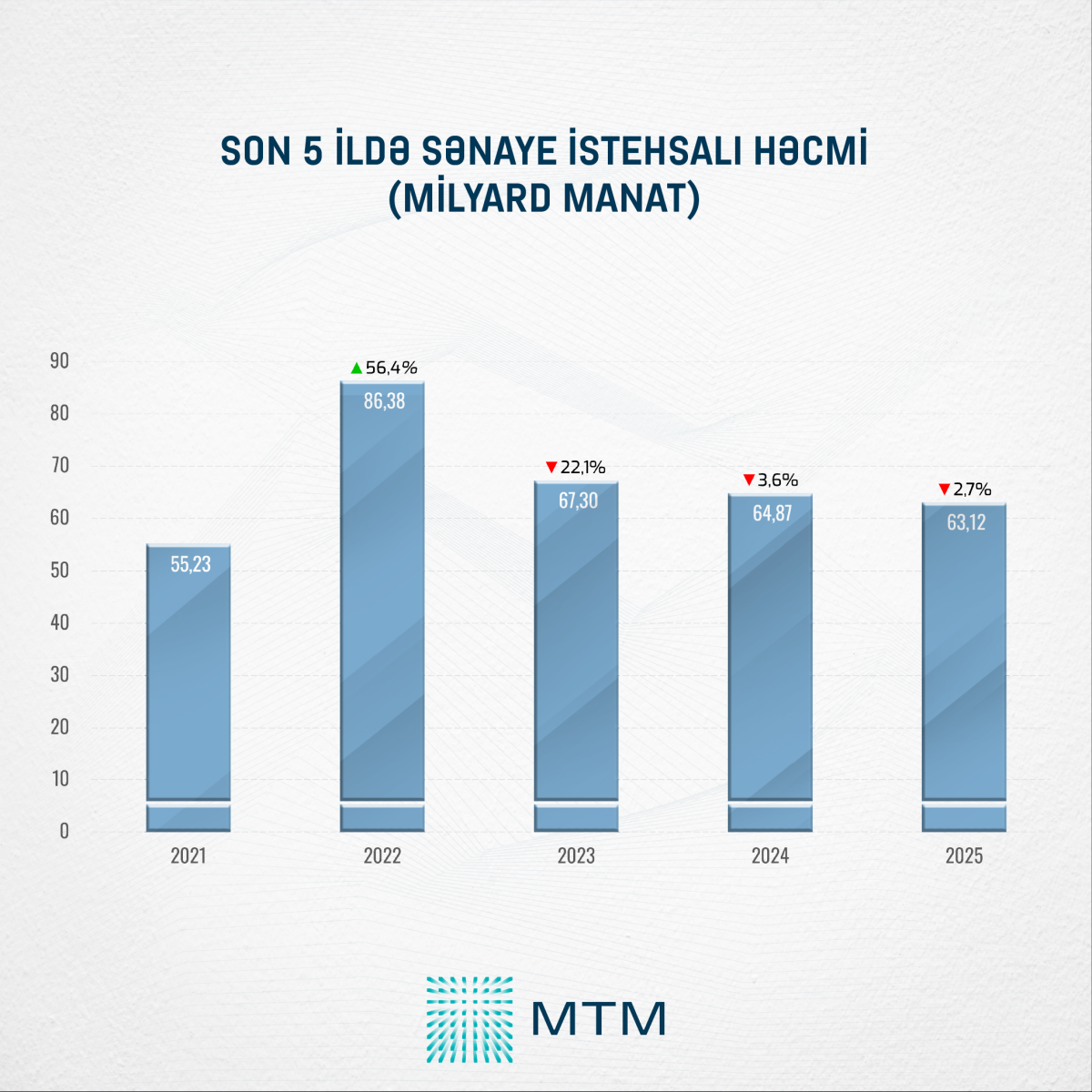 Media Təhlil Mərkəzinin (MTM) Dövlət Statistika Komitəsinin rəsmi məlumatları əsasında apardığı təhlilə görə, 2025-ci ildə ölkədə sənaye istehsalının həcmi əvvəlki illə müqayisədə 2,7 faiz və ya 1,75 milyard manat azalaraq 63,12 milyard manat təşkil edib.