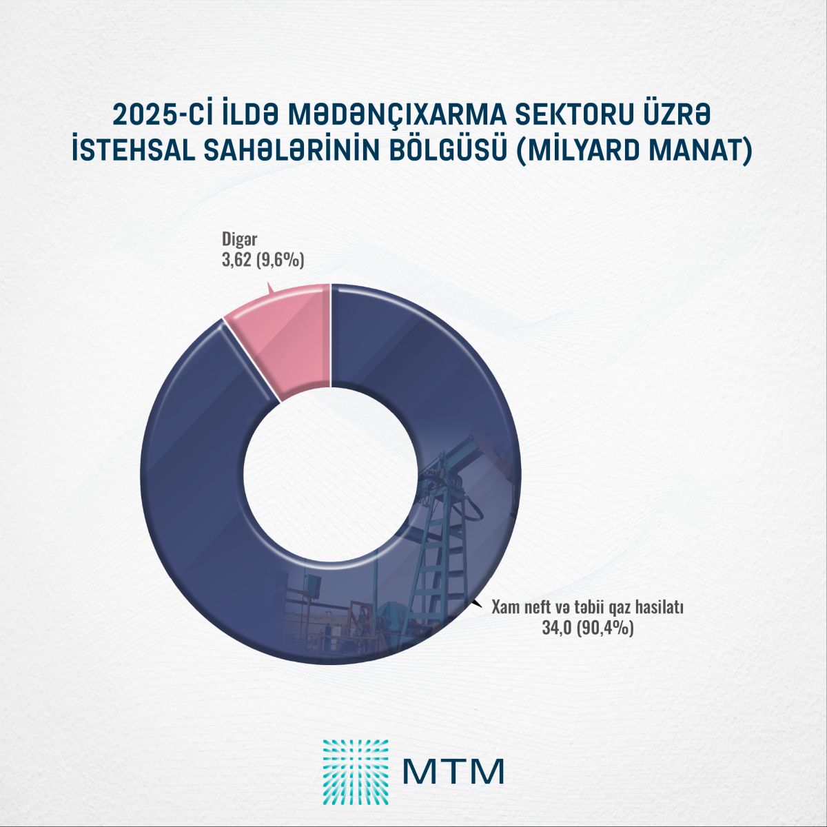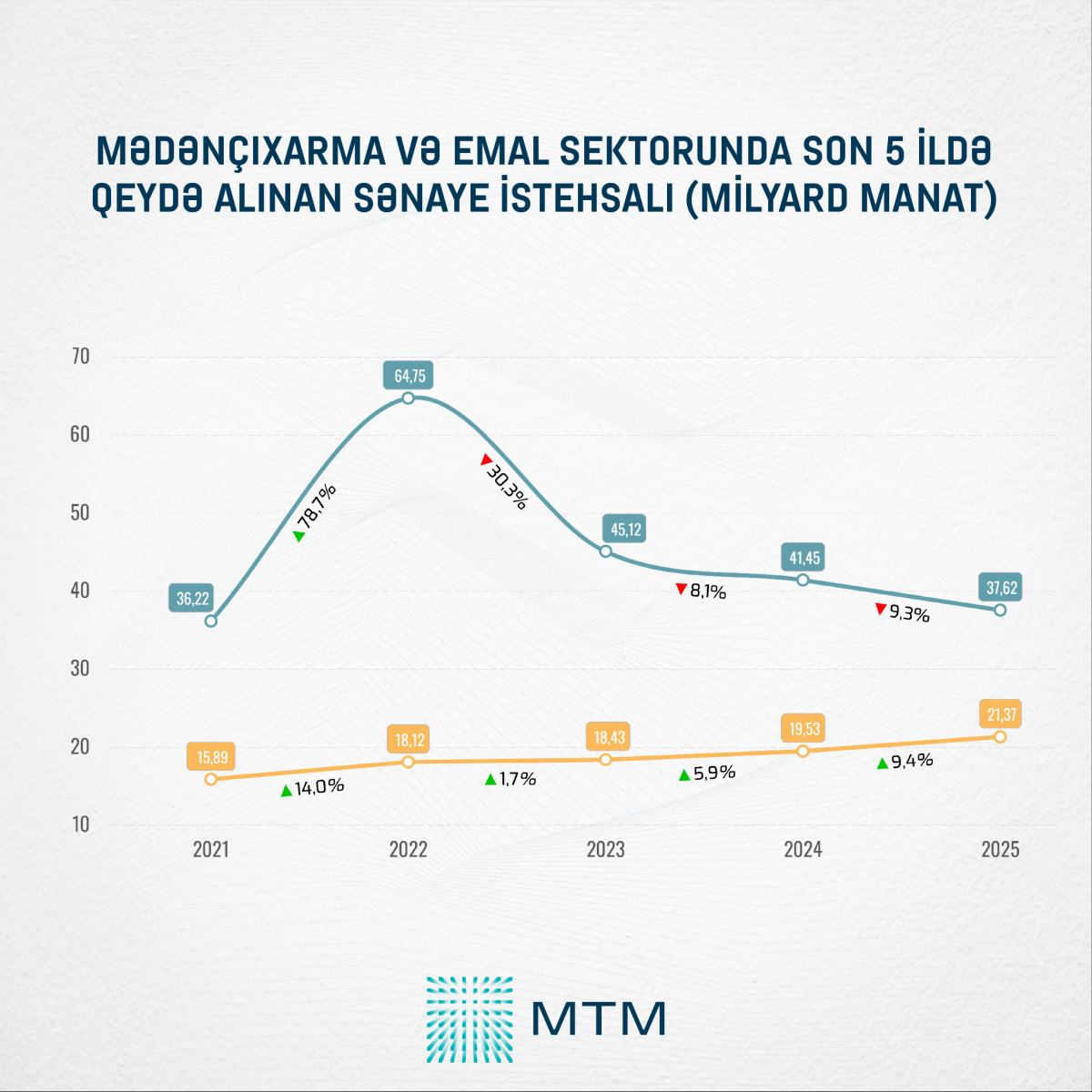 2025-ci ildə mədənçıxarma sektoru üzrə istehsalın həcmi əvvəlki illə müqayisədə 9,3 faiz və ya 3,83 milyard manat azalaraq 37,62 milyard manat təşkil edib. Bu sahədə ən yüksək göstərici isə 2022-ci ildə qeydə alınıb və həmin il istehsalın həcmi 64,75 milyard manata çatıb.